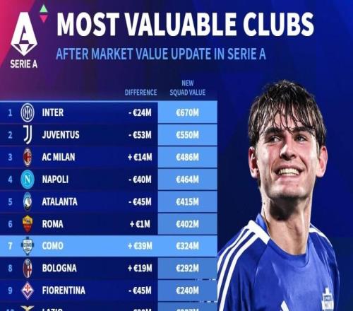 德转列意甲俱乐部身价排名:国米6.7亿欧第一,尤文5.5亿第二